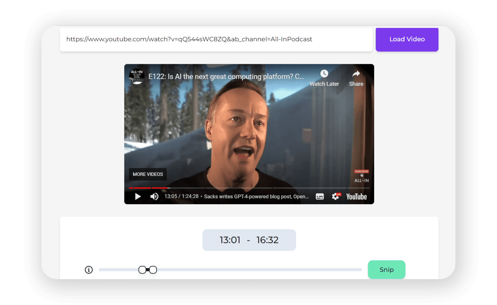 View the snippets you create, with video information, the selected timestamps, the URL and the snippet text.